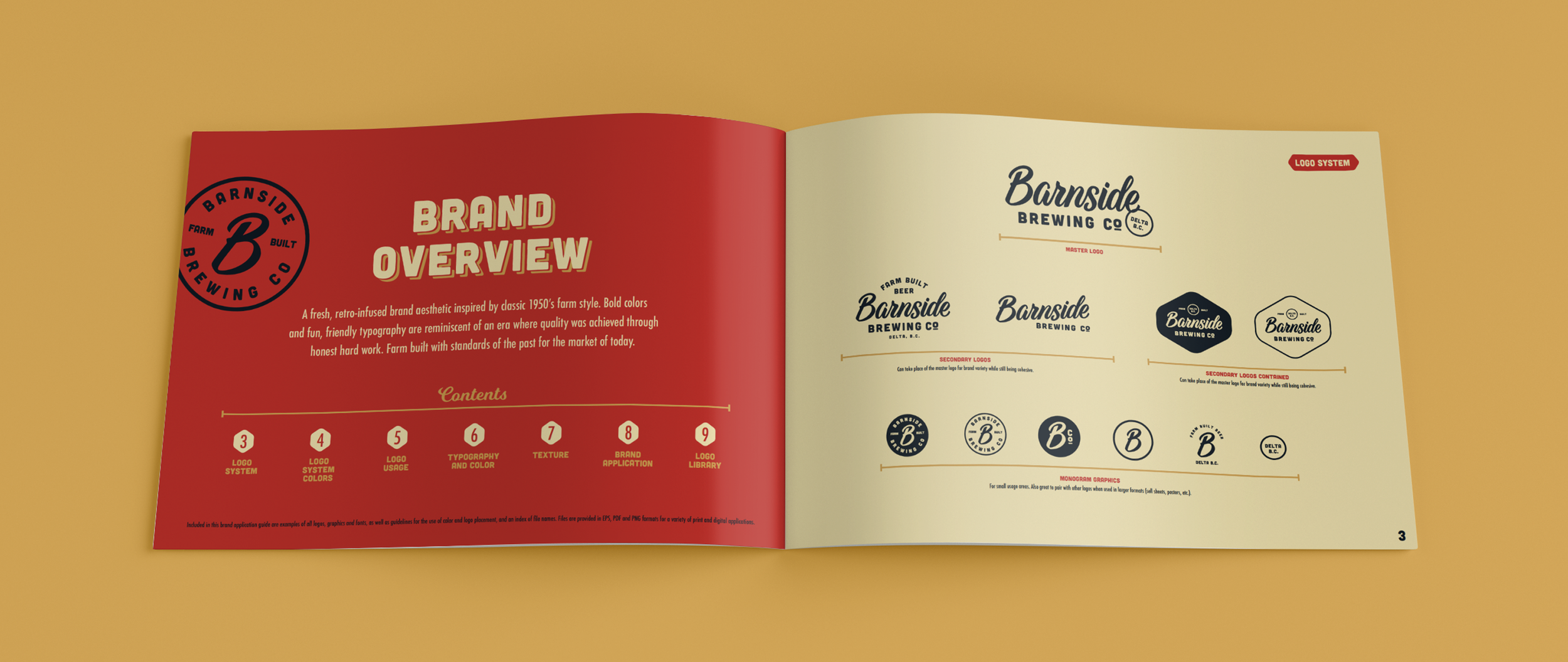 The Barnside Brewing Co. brand guideline document covered several areas of focus, like the logo system and its usage, color palette, typography, texture, and more.